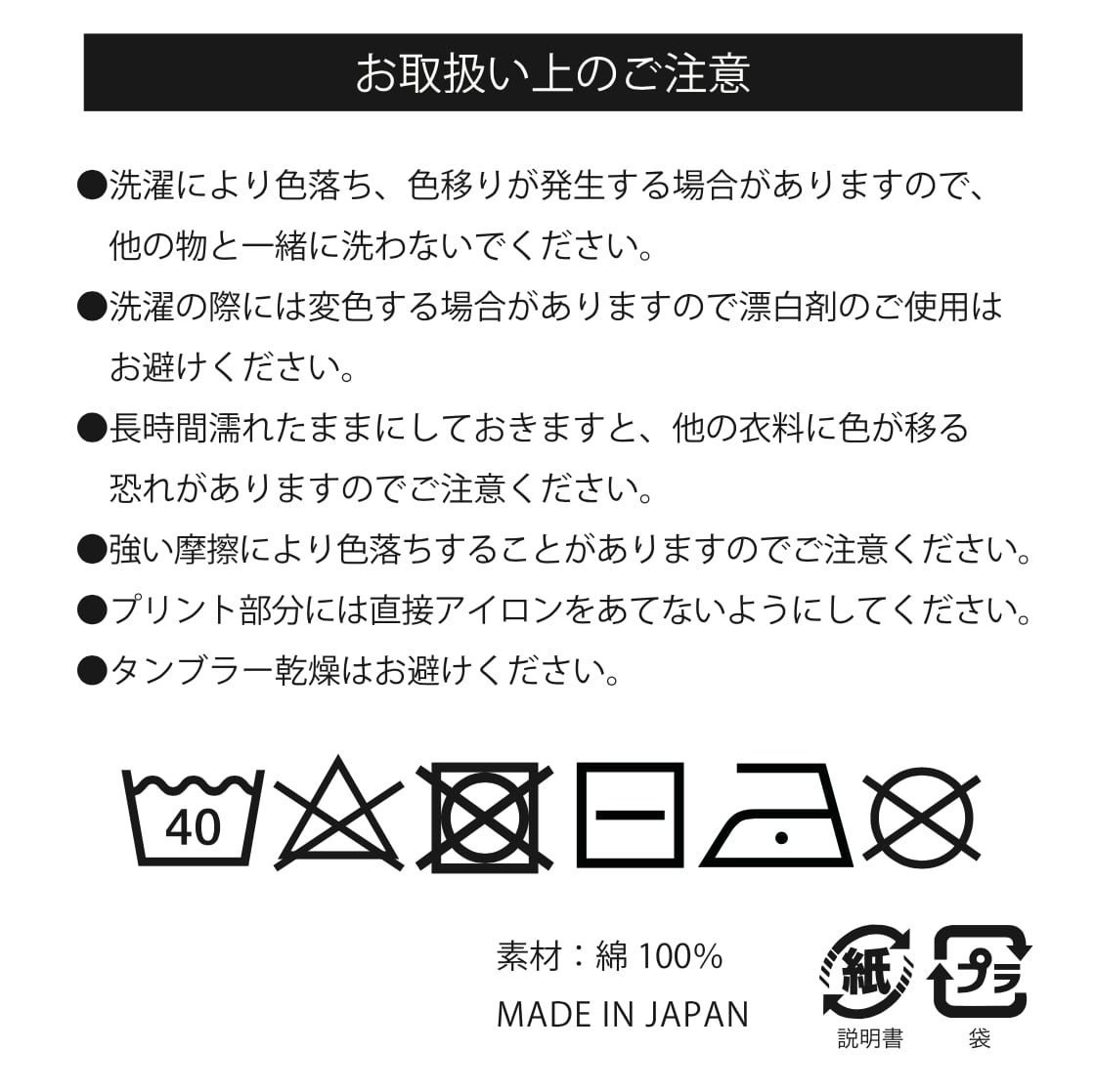 ※洗濯に際しては漂白剤や柔軟剤の使用はお避けください。また、色落ち・色移りの恐れがありますので、白色や淡色物と分けて洗ってください。
